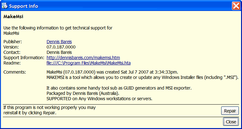 The support information and almost everything about this information is configurable. The following table tells you the native Windows Installer configuration as well as that that the "COMPANY.MMH" framework provides, at times you may clash however MAKEMSI should not prevent you being able to set the exact value you wish.